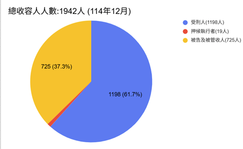 114年12月底法務部矯正署臺中看守所收容人共計1,942人,其中監獄受刑人1,198人、 押候執行者(乙種指揮書入監)19人及被告及被管收人725人,核定容額為1,452人,超額收容人數490人,超額收容比率33.7%。