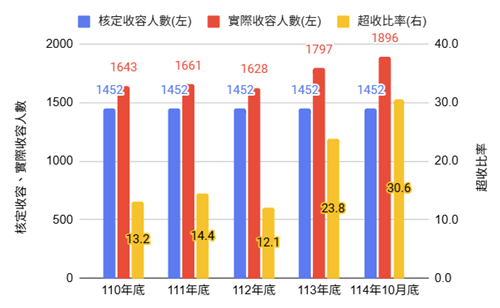 5.114年10月底在監收容人有1,896(含受刑人1,113人、押候執行者23人、被告即被管收人760人),核定容額為1,452人,超額收容444人,超收比率30.6%。